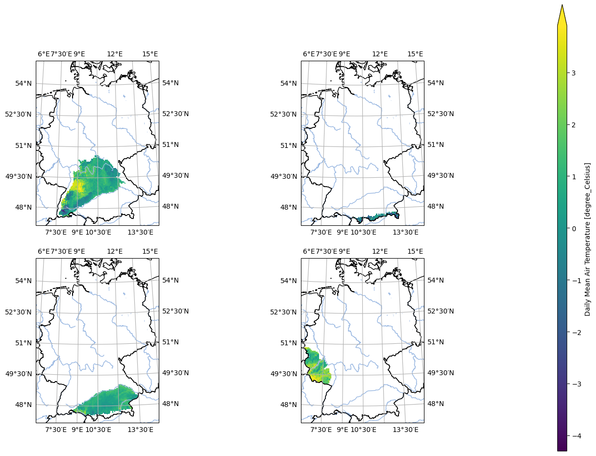 In [1]: %%time ...: import pyku ...: ...: ds = pyku.resources.get_test_data('hyras') ...: gdf = pyku.resources.get_geodataframe( ...: 'natural_areas_of_germany' ...: ) ...: ...: regionalized = ds.pyku.regionalize(gdf) ...: ...: pyku.analyse.n_maps( ...: regionalized.isel(time=0).isel(region=0), ...: regionalized.isel(time=0).isel(region=1), ...: regionalized.isel(time=0).isel(region=2), ...: regionalized.isel(time=0).isel(region=3), ...: nrows=2, ...: ncols=2, ...: crs='HYR-LAEA-5', ...: var='tas' ...: ) ...: CPU times: user 1.01 s, sys: 418 ms, total: 1.43 s Wall time: 1.21 s