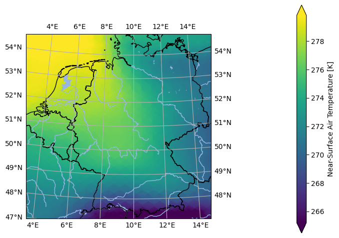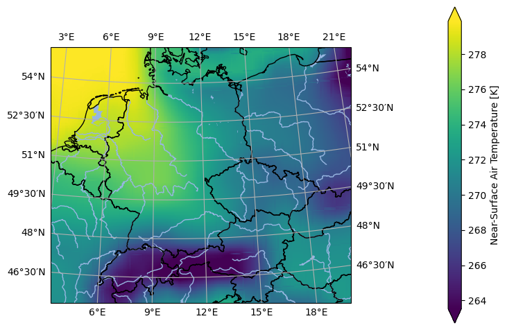 In [3]: import pyku ...: ...: # Select first timestep and wrap longitudes of global data ...: ds = ( ...: pyku.resources.get_test_data('global_data') ...: .isel(time=0) ...: ) ...: ...: # Project to HYRAS grid ...: projected = ds.pyku.project( ...: area_def='DWD_RADOLAN_900x900', ...: method='idw', ...: roi=500000, ...: power_parameter=1 ...: ) ...: ...: # Plot ...: projected.ana.one_map(var='tas', crs='DWD_RADOLAN_900x900') ...: