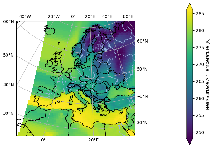 In [1]: import pyku ...: ...: # Select first timestep and wrap longitudes of global data ...: ds = ( ...: pyku.resources.get_test_data('global_data') ...: .isel(time=0) ...: ) ...: ...: # Project to HYRAS grid ...: projected = ds.pyku.project(area_def='EUR-44') ...: ...: # Plot ...: projected.ana.one_map(var='tas', crs='EUR-44') ...: