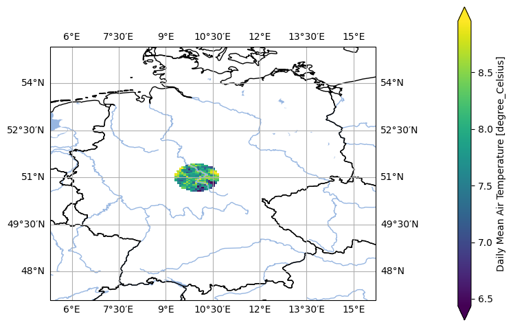 In [1]: import pyku ...: ds = pyku.resources.get_test_data('hyras') ...: selection = ds.pyku.select_neighborhood( ...: lat=51, ...: lon=10, ...: roi=50000, ...: neighbours=1000, ...: crop=False ...: ) ...: selection.ana.mean_map(var='tas') ...: