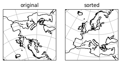 In [1]: import matplotlib.pyplot as plt ...: import pyku ...: ...: plt.close('all') ...: ...: # Get coordinate reference system of original data ...: # ------------------------------------------------ ...: ...: ccrs_original = ( ...: pyku.resources.get_test_data('model_data') ...: .pyku.get_area_def() ...: .to_cartopy_crs() ...: ) ...: ...: # Get coordinate reference system of sorted data ...: # ---------------------------------------------- ...: ...: ccrs_sorted = ( ...: pyku.resources.get_test_data('model_data') ...: .pyku.sort_georeferencing() ...: .pyku.get_area_def() ...: .to_cartopy_crs() ...: ) ...: ...: # Plot side-by-side ...: # ----------------- ...: ...: plt.figure(figsize=(10, 5)) ...: ...: ax1 = plt.subplot(2, 2, 1, projection=ccrs_original) ...: ax1.set_title('original') ...: ax1.set_global() ...: ax1.coastlines('auto') ...: ax1.gridlines() ...: ...: ax2 = plt.subplot(2, 1, 1, projection=ccrs_sorted) ...: ax2.set_title('sorted') ...: ax2.set_global() ...: ax2.coastlines('auto') ...: ax2.gridlines() ...: Out[1]: <cartopy.mpl.gridliner.Gridliner at 0x7f53b8e60cb0>