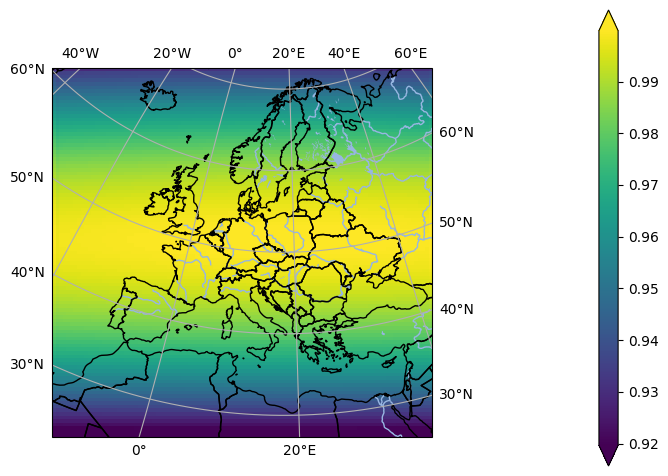 In [2]: import xarray, pyku ...: import pyku.analyse as analyse ...: ds = pyku.resources.get_test_data('global_data') ...: ds = ds.pyku.project('EUR-44') ...: ds = ds.pyku.set_spatial_weights(how='area') ...: analyse.one_map(ds.weights, crs='EUR-44') ...: